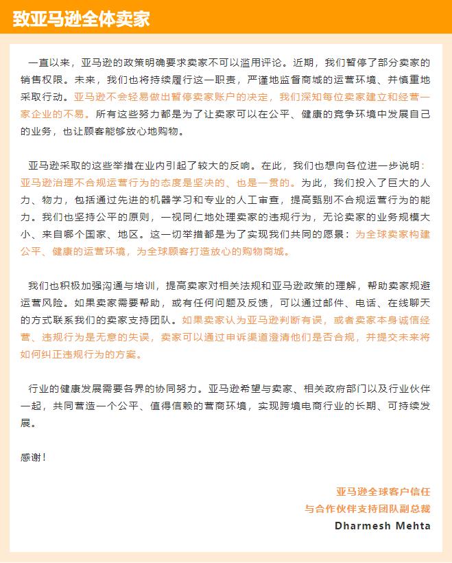 昨日,亚马逊发布了一封致全体卖家的邮件,针对近期事件引发的猜测作出回应,内容如下↓