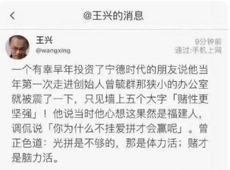 美团王兴对曾毓群非常推崇,认为他是任正非式的人物。王兴曾发朋友圈表示,曾毓群的办公室挂着一幅“赌性坚强”的条幅。曾毓群直言:“光拼是不够的,那是体力活,赌才是脑力活。”