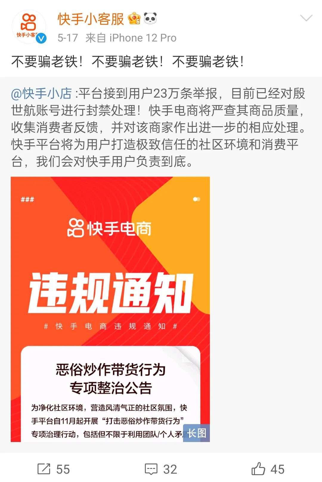 5月17日,快手小店发微博称,就殷世航炒作卖货、低俗演戏和虚假宣传等违规行为,共计收到了23万多条举报,平台目前已经对其账号进行封禁,并关闭了直播功能。