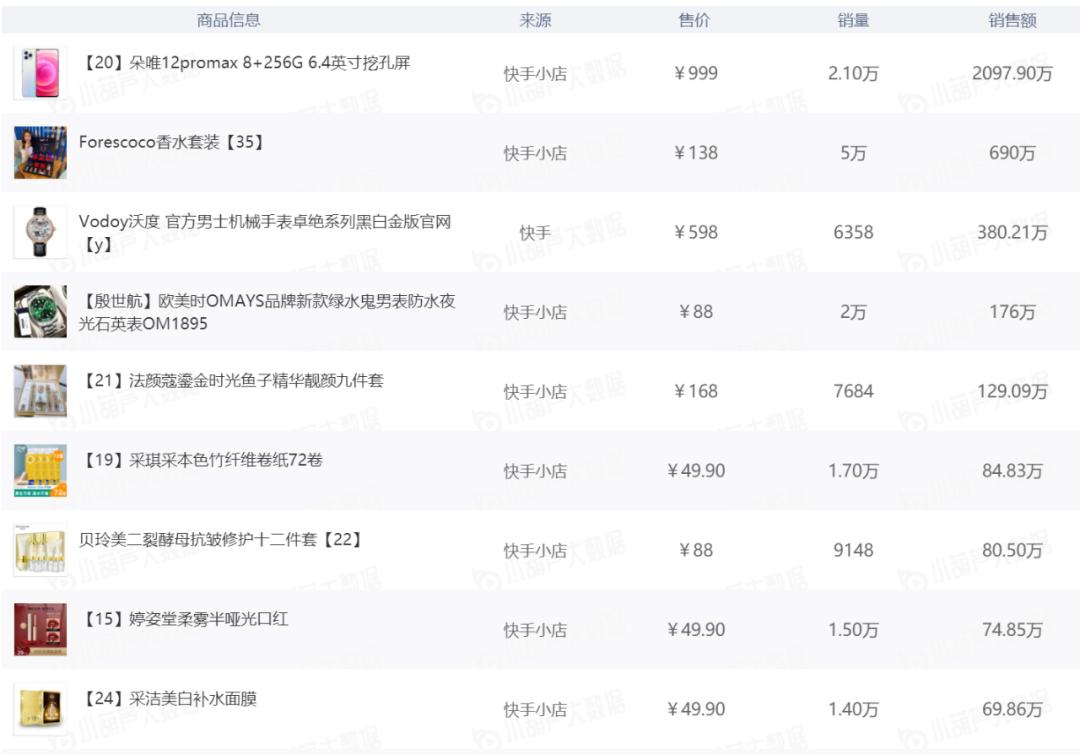毒眸查看了当天直播的商品类目,以珠宝饰品居多,达到7件;其次是居家物品(6件)和彩妆(6件),还包含服装箱包、食品饮料和手机数码。其中,一款单价999元的手机,卖出了2097万,是当天GMV最高的单品。