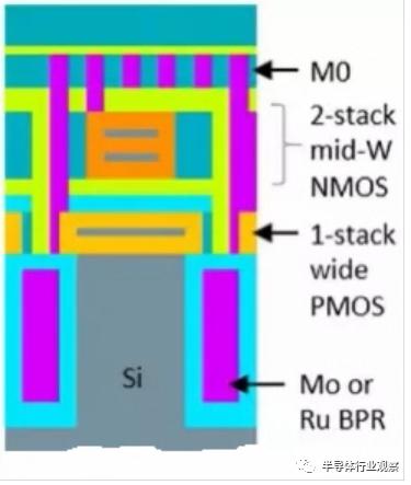对于中间工序而言,为了进一步缓解布线拥挤并满足新提出的晶体管结构的要求,该工序需要进一步创新。例如,在CFET中,需要为接触栅极提供新的解决方案,现在,这对于nFET和pFET器件来说是通用的。此外,高纵横比的通孔把各种构件互连起来,这些构件现在已经扩展到三维。但是,这些深通孔的主要寄生电阻需要降低。这可以通过引入先进的触点来实现,例如使用钌。
