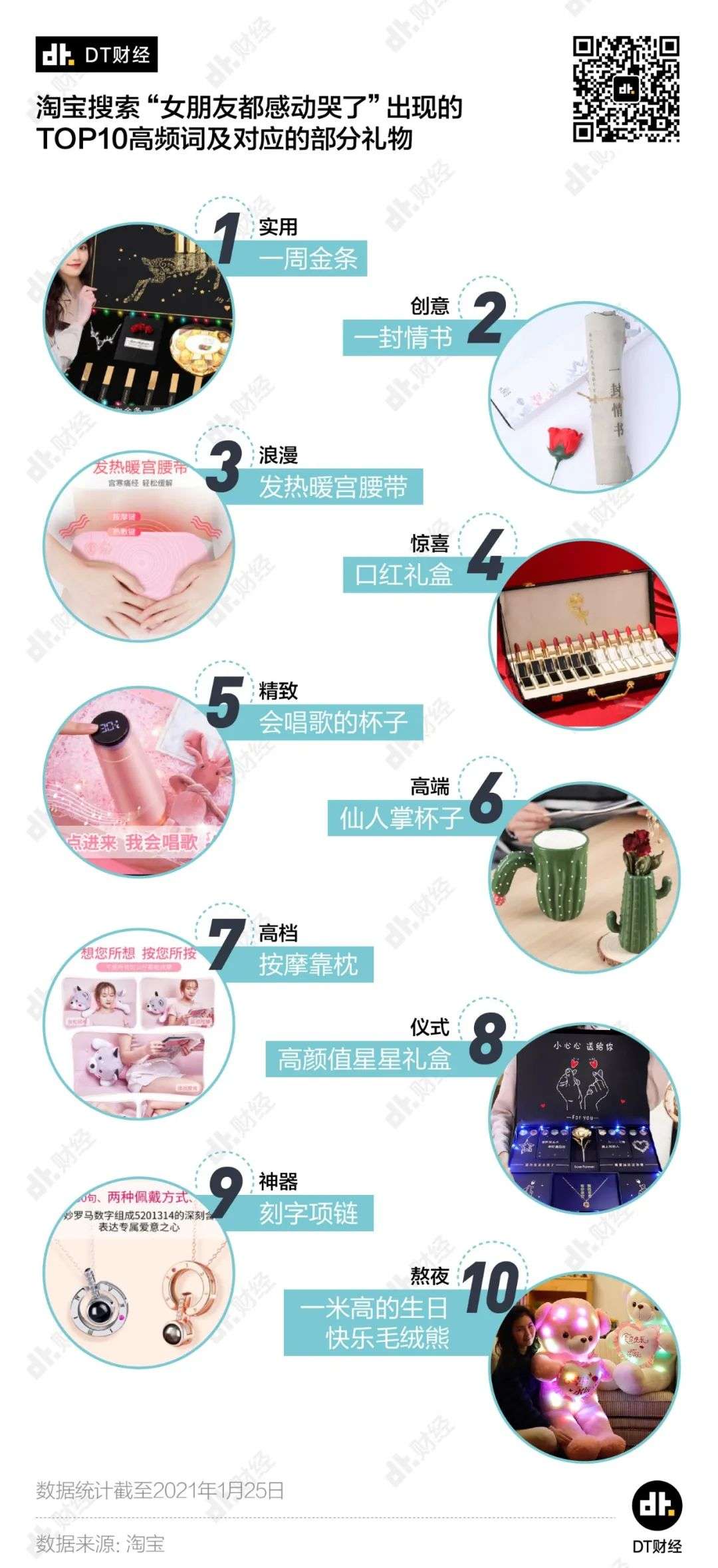 当用情至深的他们搜索淘宝,意图感动对方时,会情不自禁地搜索最高标准——「女朋友都感动哭了」。