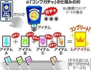 2012年5月,日本消费者厅发布了名为《关于网络游戏的“Complete Gacha”与景品表示法的景品规制》的声明。“Complete Gacha”是指“集齐指定数量和卡牌(角色/道具)后可以合成(获得)更加稀有卡牌”的玩法。该规定将此玩法视为违反景品(兑换用商品)表示法的行为。