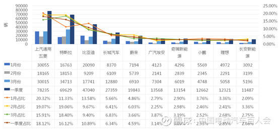 图 | 一季度新能源汽车销量TOP10厂商,含纯电动、混合动力、增程式* 来源:2021年一季度新能源乘用车终端销售数据发布PPT