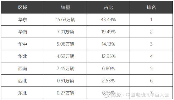 而东北地区三省辽宁、吉林、黑龙江的GDP分别为5844.9亿元、2771.46亿元、2692.5亿元。虽然东北地区的省市比华东少一半多,但即使加上西北地区3省2区(陕西、甘肃、青海、宁夏回族自治区、新疆维吾尔自治区)的销售数量,也统共才达到1.18万辆,占比3.29%,是华东地区的十几分之一。