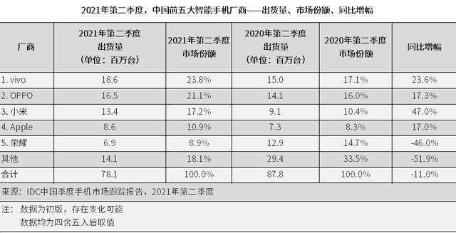但是值得注意的是,在市场份额方面,据IDC2021年第二季度的数据显示,OV牢牢占着市场前两名,占据着超过35%的市场份额。虽然小米正以较快的速度追赶,但是在出货量上面依然有所差距。