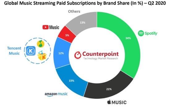 而根据Counterpoint Research 发布的数据,2020年第一季度全球在线音乐流媒体订阅量达到3.94 亿,其中Spotify占据了全球流媒体市场 30%的流媒体收入和 33%的订阅量,Apple Music 获得了25%的流媒体收入和21%的订阅量。可以推算出,截至2020年第一季度,Spotify订阅用户数量达到1.3亿,而Apple Music则拥有8200多万订阅用户。