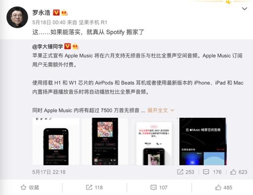 苹果发声后,罗永浩的“摇摆”代表了不少用户的心态,也再次证明了一件事:Apple Music和Spotify的竞争越发激烈了。