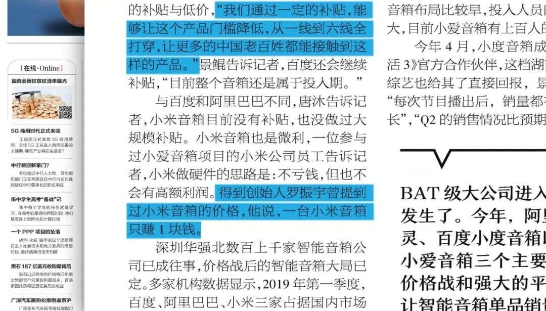 智能音箱在出货量上涨的同时却没给巨头们带来利润。2019年,百度副总裁景鲲向媒体表示,百度是通过补贴维持了小度音箱的低价。而另据业内人士估算, 每卖一台小爱音箱,小米只赚1块钱。