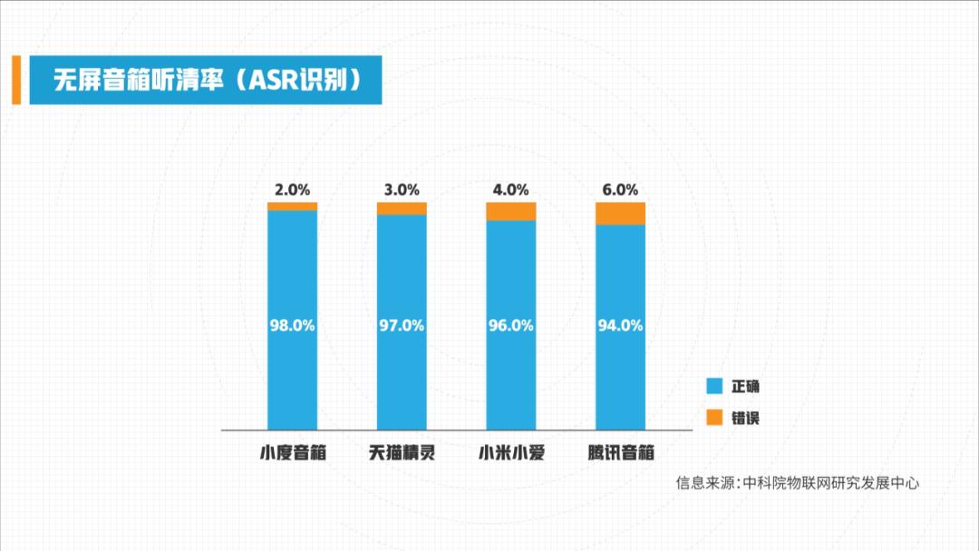 三大流程对应着3种技术,其中ASR(自动语音识别)和TTS(处理结果转化成语音输出)技术相对成熟,像ASR已广泛应用在语音转文字、语音输入法、智能翻译笔等应用上。据中科院2019年的测试, 国内四家主流智能音箱品牌ASR识别率均在94%以上。