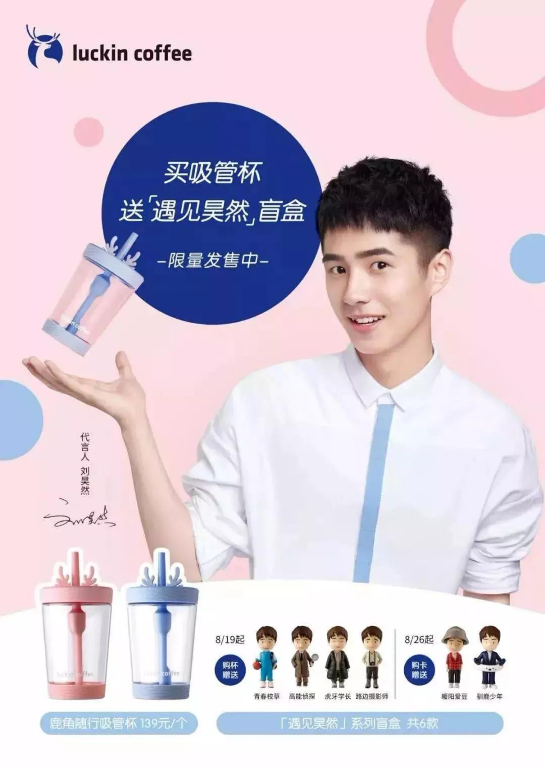 所以有了盲盒玩法的进步——自己做玩具。旺旺将雪饼、仙贝这些零食做成仿真玩具,售卖小型的盲盒和大型的“明盒”;瑞幸则将代言人刘昊然的形象做成了玩偶,化用盲盒促销杯子,本质还是粉丝经济。