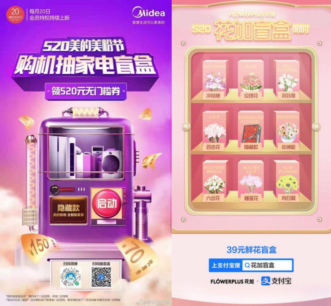 短短两年,盲盒营销已经扩展到文具、图书、奶茶等日常消费,覆盖的年龄段也扩大化。盲盒营销还成为了节日的重要营销方式,今年520,鲜花盲盒、家电盲盒层出不穷,为了讨好年轻人,品牌在“盲盒”上用尽了力气。