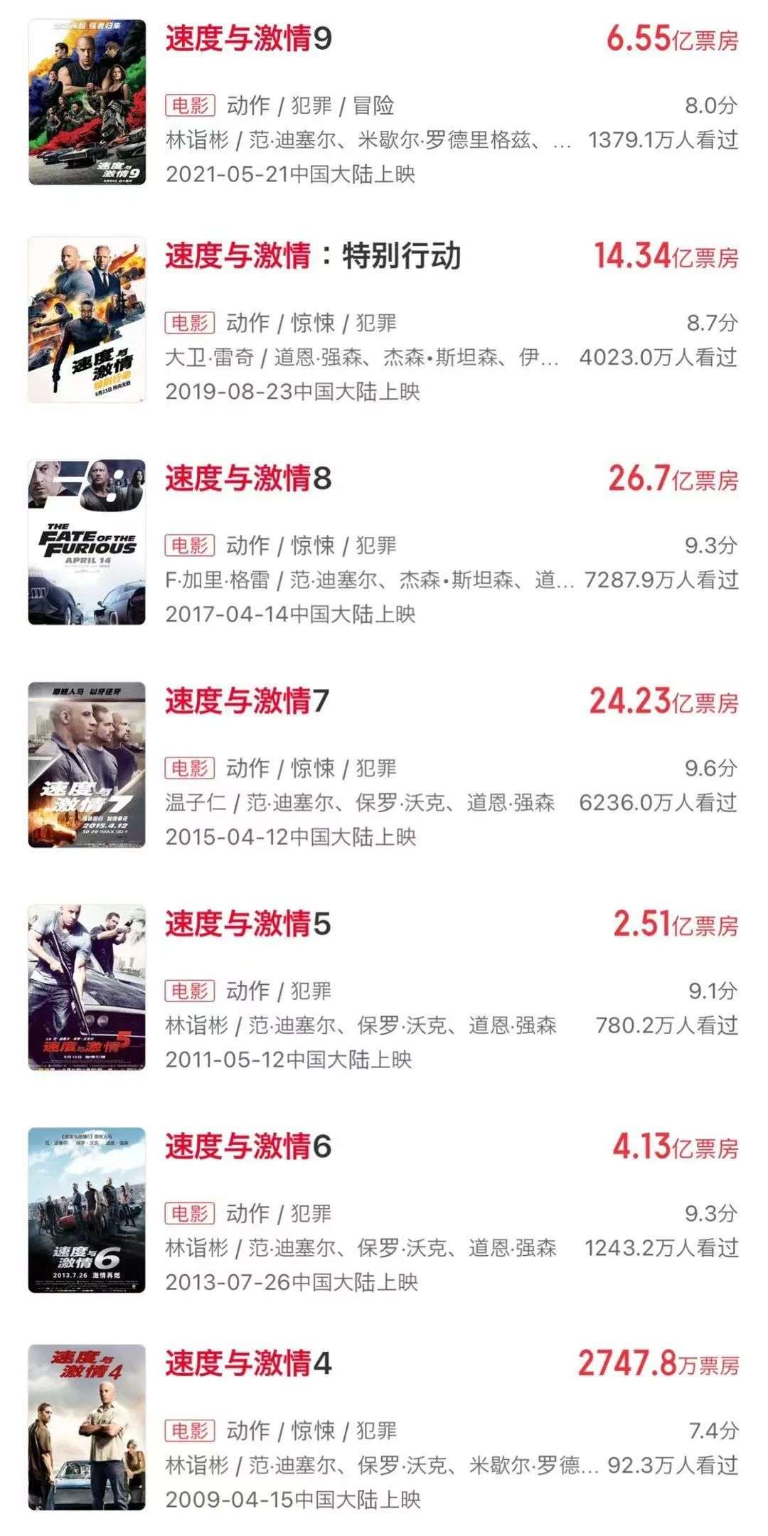 和同系列前作相比,《速9》开局口碑崩盘必然会对票房造成很大影响。