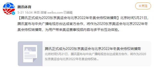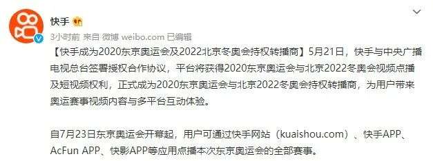 平地响惊雷,5月21日下午,快手、腾讯两大平台相继宣布其拿下了2020年东京奥运会与2022年北京冬奥会的视频权益。