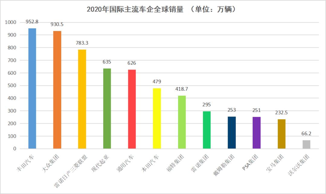 2020年国际主流车企全球销量, 数据来源于IHS Markit,连线出行制图