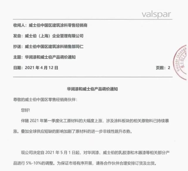 今年3月起,三棵树(603737.SH)、威士伯、立邦等涂料企业陆续发布涨价函,称受到钛白粉等化工原料上涨影响,将上调各类涂料价格5~20%不等。