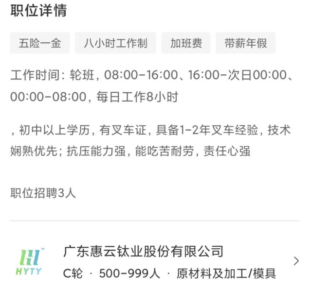 5月19日,时代财经走访惠云钛业时,发现其同样是满负荷状态。刚过下午四点,不少工人骑着电瓶车离开厂区。一位六都镇居民告诉时代财经,惠云钛业是“三班倒”,下午四点钟正好是白天换班的时间。其招聘网站信息也证实了这一点。