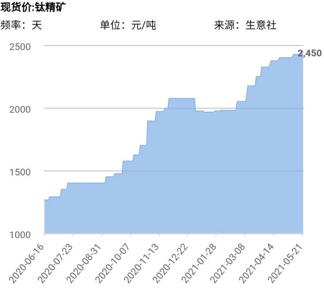 根据生意社数据显示,从2020年6月到2021年5月,制备钛白粉所需的重要化工品——硫酸的价格从每吨不到300元,一度上涨到逾600元;而同期的钛精矿价格也从1200元/吨左右,上涨到目前的2450元/吨,涨幅超过100%。