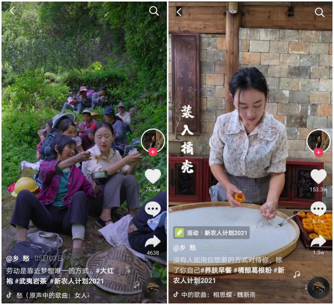 (左为沈丹领着乡亲们上山采茶,右为沈丹用非遗技法制作养肤早餐/图源抖音@乡愁)