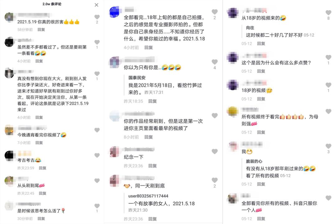 从这个角度看,就不难理解这条回忆视频为什么能让沈丹暴涨近百万粉丝了。许多粉丝在关注@乡愁账号后,还将沈丹的视频从头翻到了尾,打开沈丹的第一条视频,就可以看到这些“满心欢喜”的粉丝留下的“考古”评论。