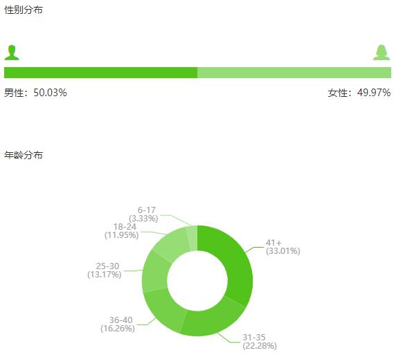 据飞瓜数据显示,@乡愁的粉丝群体男女比例均衡,年龄大多分布在30岁以上。
