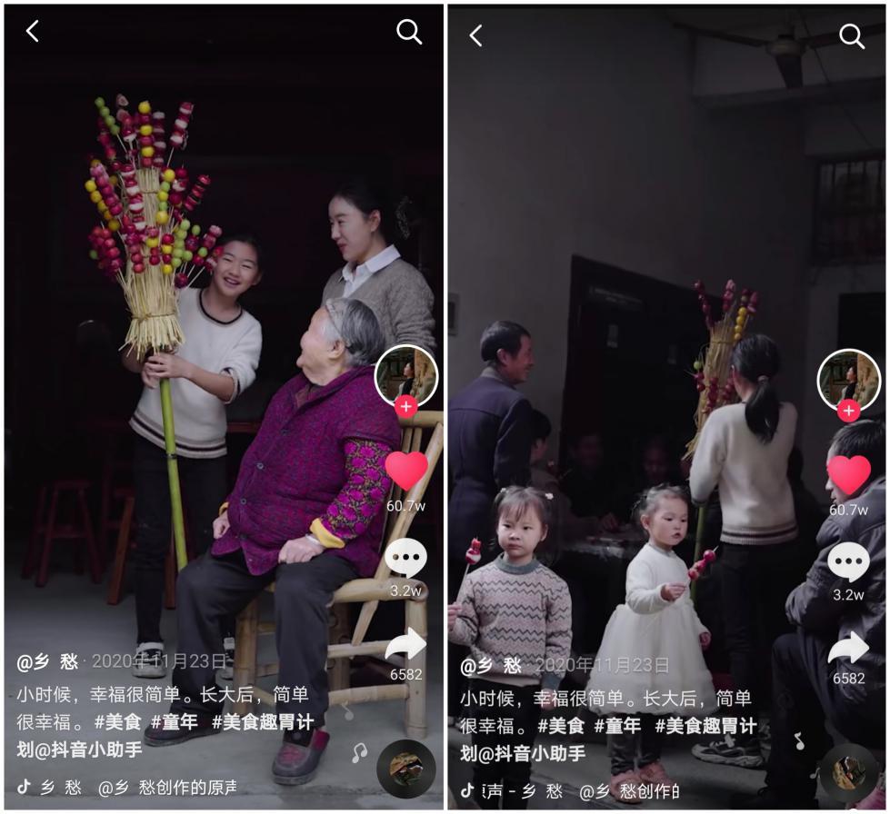 与之相反,沈丹的视频几乎没有拍景的空镜头,“人”永远是镜头下的主角,更具烟火气和人情味。这就是田园题材的魅力所在,可以是李子柒的寄情于景,也可以是沈丹的直抒胸臆。