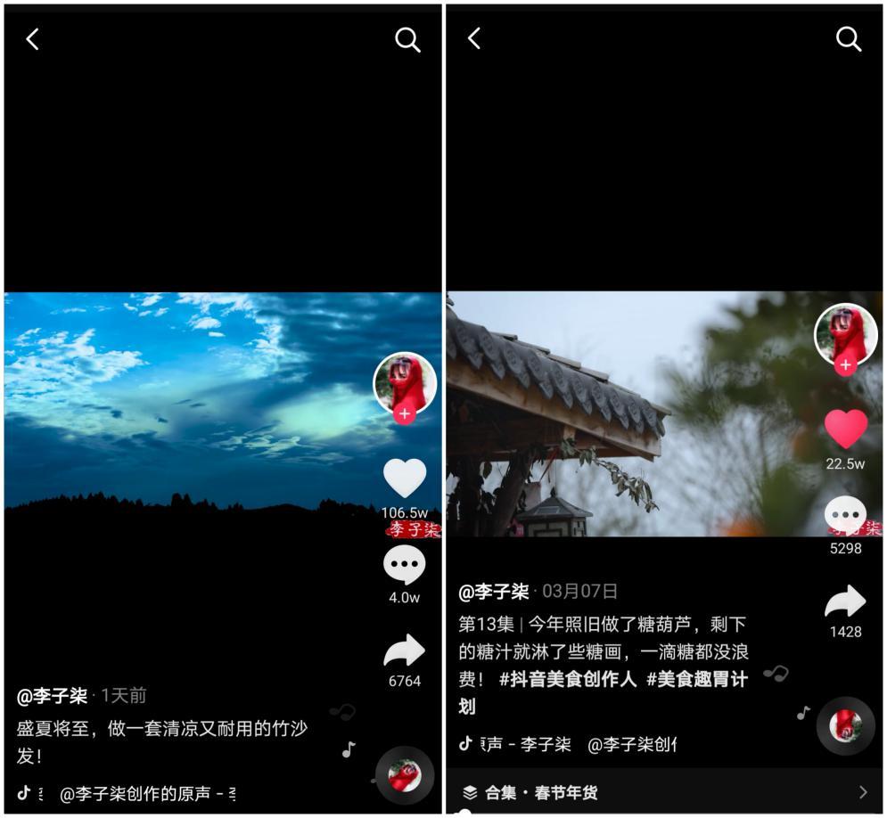 两人在内容上的取舍,恰恰证明了两人创作的聚焦点不同——李子柒是“抽象派”,给予观众的是聚焦山水和田园的视觉享受;沈丹是“写实派”,给予观众的是聚焦农事与人情的细节体验。更广义的表达则为,李子柒在文化传播,沈丹在生活分享。