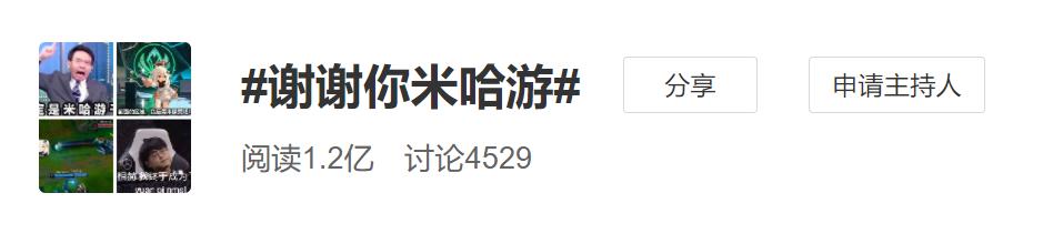 于是在4月24日凌晨,几乎和#RNG夺冠#同时,话题#谢谢你米哈游#也登上了微博热搜。