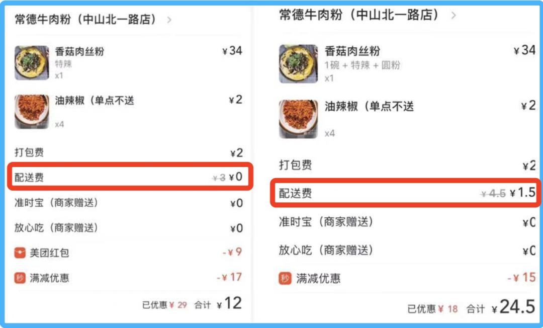 一位美团外卖上海用户提供的订单显示,在距离其3公里内的一家米粉店,今年1月和2月早、中、晚三个时段多次下单,配送费均为3元,算上补贴活动后直接减免;而在5月再次尝试下单时,配送费就涨到了4.5元,算上补贴活动仍需支付1.5元。