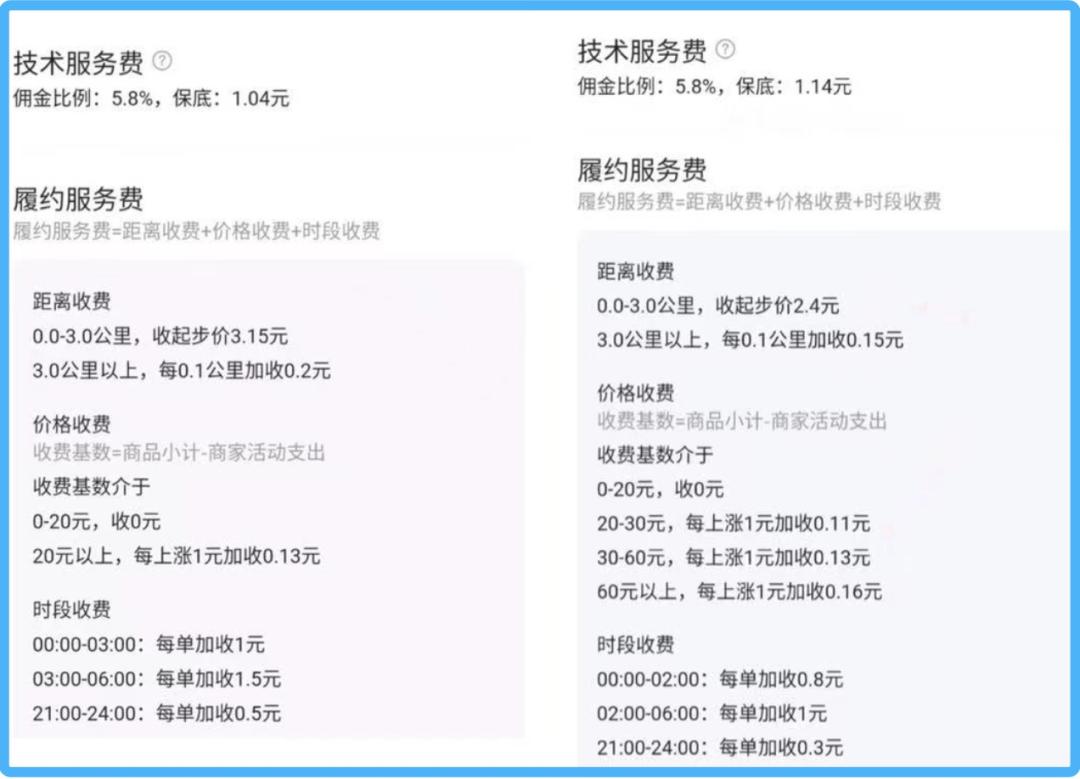不难看出,新规实行了较低的技术服务费抽佣比例,一旦商家采用自配送方式,仅需向平台支付技术服务费,保底费用1元多,较此前明显降低;但选择平台配送的商家,则需在技术服务费的基础上,再遵循履约服务费规则,后者对于3公里以外、深夜时段等特殊订单,收取费用会有所增加。