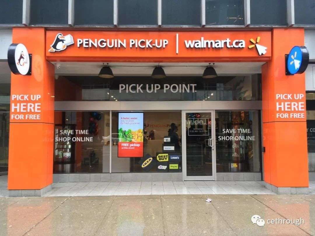 Penguin pick-up (企鹅自提)在加拿大有76个门店,其中37个在偏市中心地区。客户在Walmart上下单后,可以在社区里最近的penguin pickup地址自提,非常便于那些在城市中心居住,附近没有Walmart实体超市的客户。