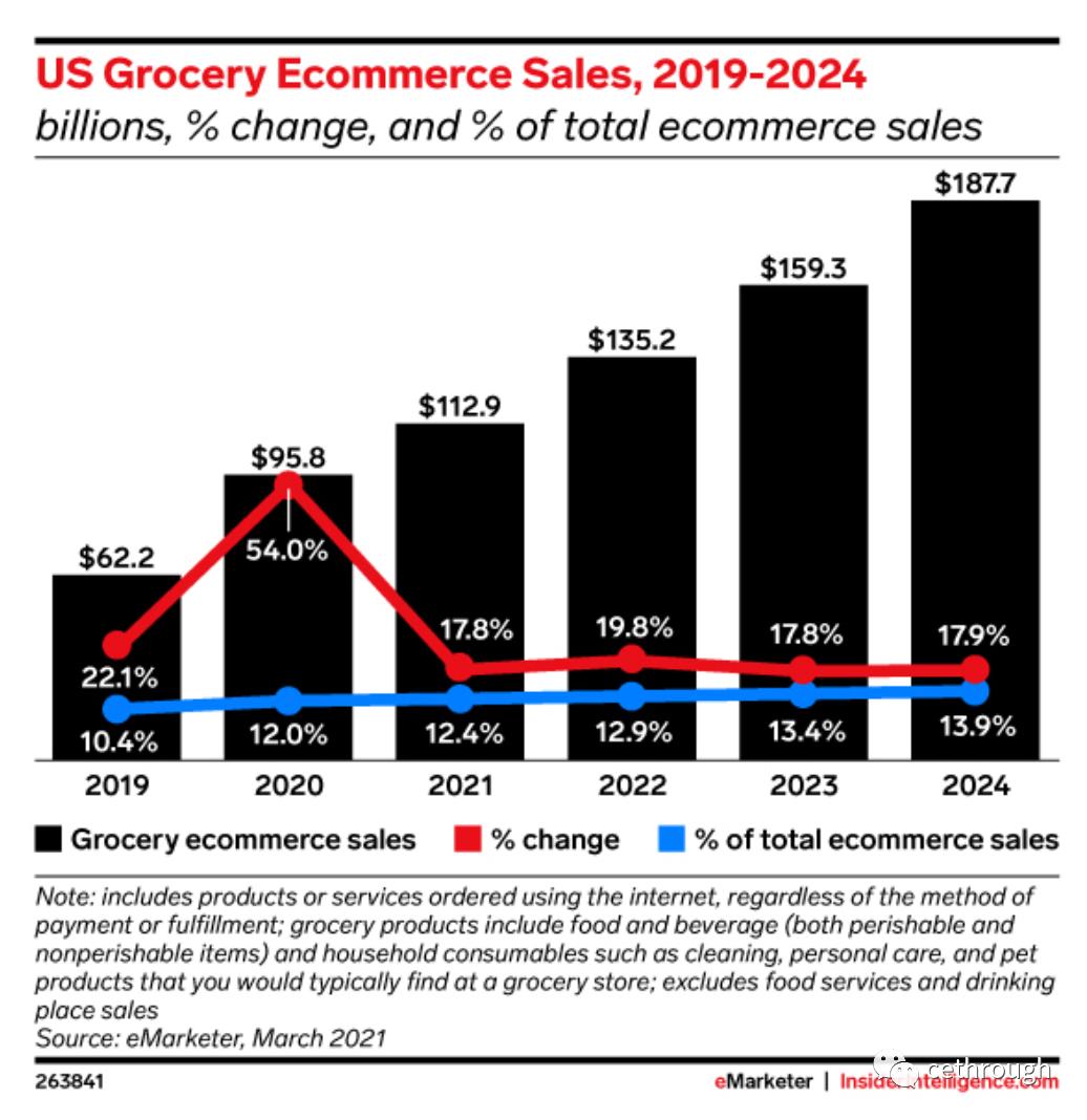 由于在北美疫情的爆发和政府对线下出行的管制,许多美国居民在2020年第一次尝试线上买菜。也让这个行业在美国的总销售额在2020年间经历了54%左右的涨幅。