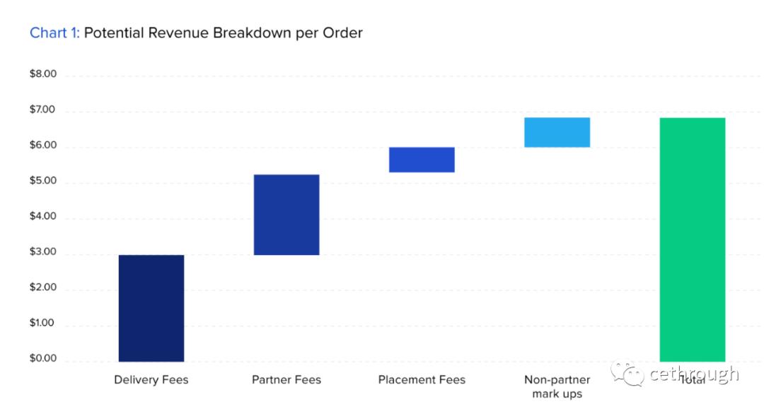 图中的4种类型的收益中,delivery fee(派送费)和 markups(平台加价费)属于C端客户需要承担的费用, 而Partner Fees (商家端收取的平台抽成)以及Placement Fees(商家的排位费), 都是从B端收取的。