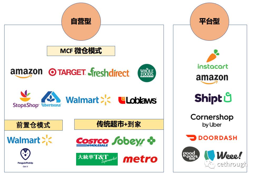 我把北美的生鲜电商玩家进行了总结和分类。分为自营型,比如说Walmart,Whole Foods这种拥有自己门店的公司,以及第三方平台,比如说Instacart,Cornorshop By Uber等模式。