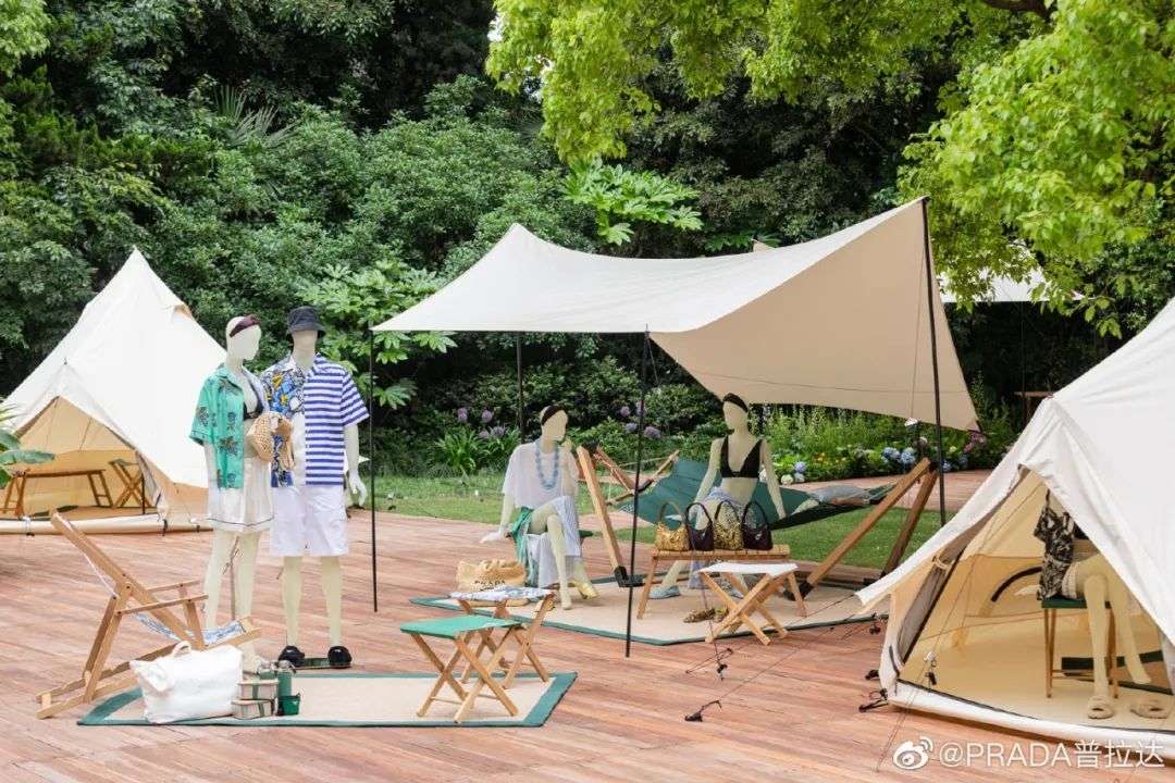 对这股趋势最直白的表达要属Prada最近开设的以户外主题为灵感的Prada Outdoor春日篇“意趣花园”限时店。 为此品牌将Prada荣宅打造为一座豪华私人花园,设有适合品茶的休闲帐篷、帆布躺椅、日光室和野餐区,以营造逃脱城市的悠闲氛围。