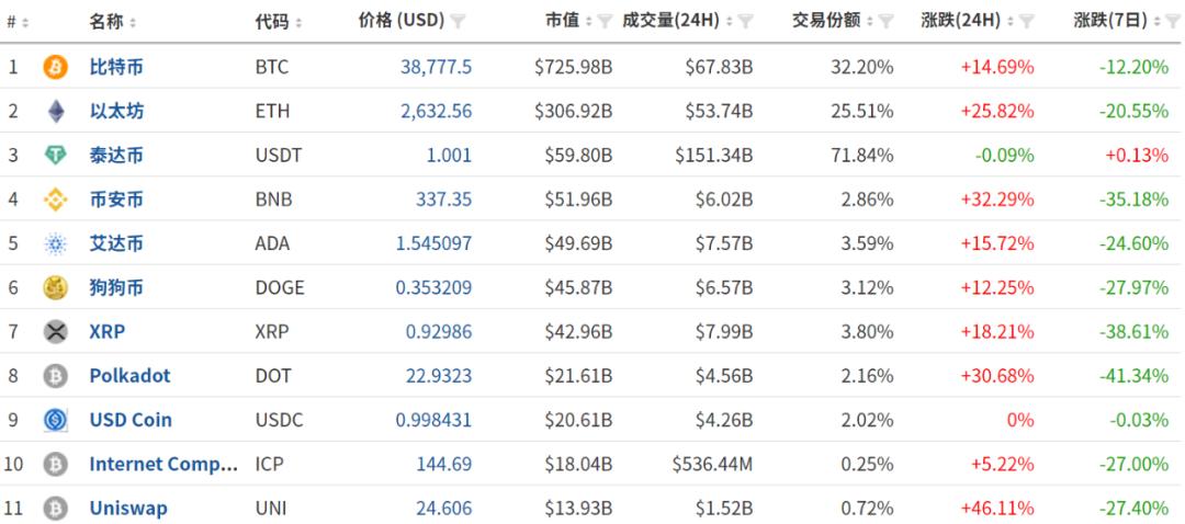 比特币(BTC)在美东时间上周日、北京时间周一凌晨曾跌破3.2万美元,逼近上周三险守3万美元关口所创的四个月盘中低位,较日内高位跌去6000多美元,此后持续反弹,美股尾盘曾短线逼近4万美元关口刷新三日高位,较日内低位回涨6000多美元,24小时涨幅一度达到20%,美股收盘时处于3.97万美元上方,最新的价格在3.8万美元之上。