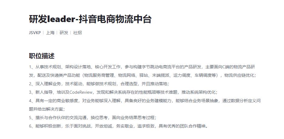 而在字节跳动社招官网,一个名为“研发Leader-抖音电商物流中台”的岗位,显示了其供应链-物流中台在上海office仍继续在招工程侧架构师。