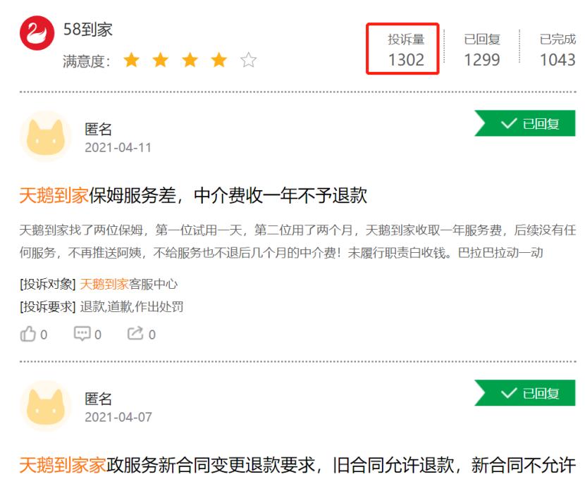此外,天鹅到家被消费者投诉的频率也较多。在黑猫投诉等网上渠道上可以发现,针对其投诉事件多达1300余起,包含了保姆不专业服务差、平台不退服务费、中介费过高等涉及到服务质量的问题。