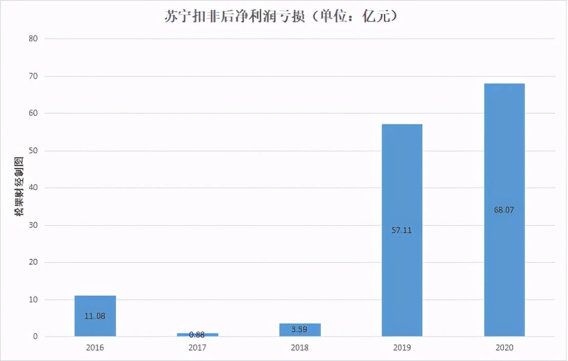 值得注意的是,自2014年起,苏宁扣非后净利润一直处于亏损状态。2016年—2020年,扣非后净利润亏损分别达到11.08亿元、8839.10万元、3.59亿元、57.11亿元以及68.07亿元。