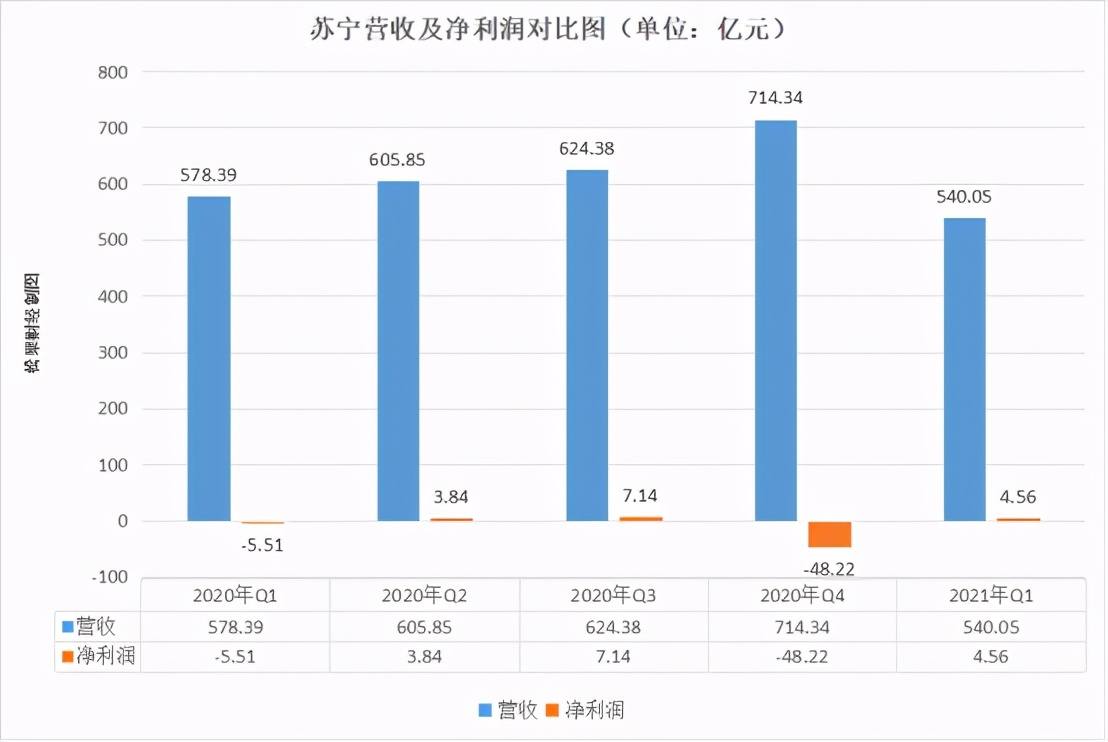 *2021年第一季度,苏宁易购营收540.05亿元,净利润回正达4.56亿元;