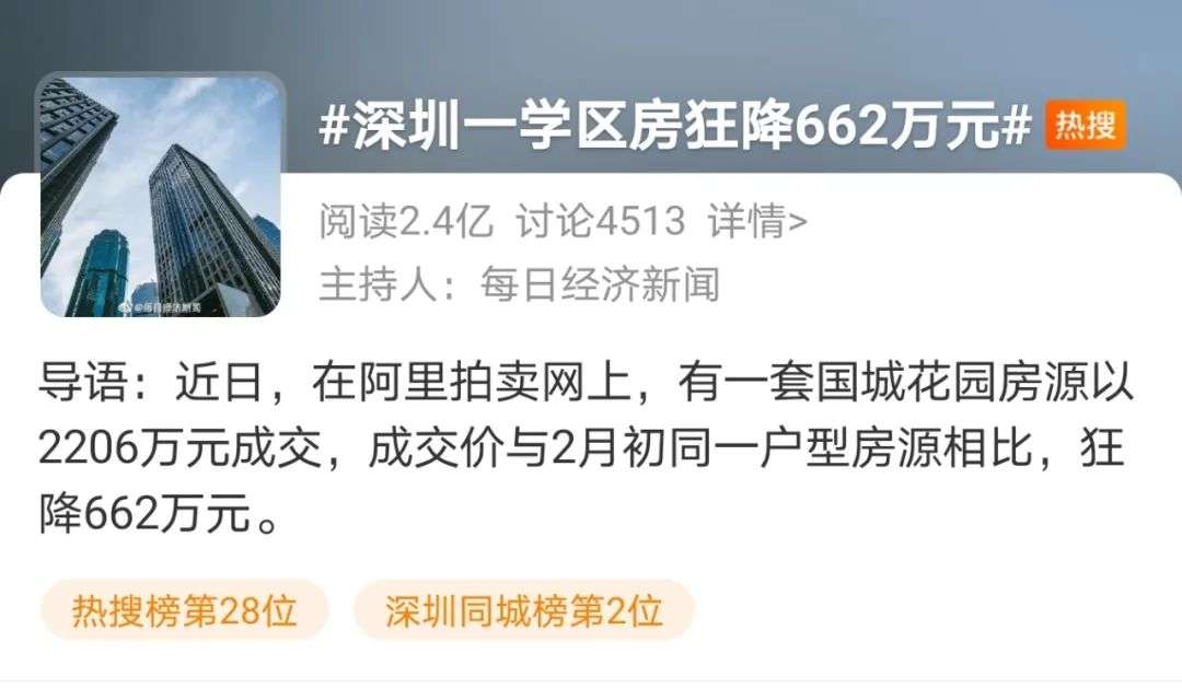 23日,据中国证券报消息,深圳一套国城花园的学区房房源,在阿里拍卖网上,经过147次出价后,最终以2206万的价格卖出。相较2月份时一套同样户型的房子的成交价,狂泄了662万!