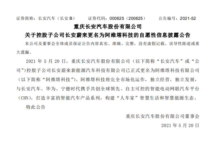5月20日长安汽车发布公告信息披露,公司控股子公司长安蔚来新能源汽车科技有限公司(以下简称长安蔚来)已正式更名为阿维塔科技,将成为长安汽车、华为、宁德时代联合打造的高端品牌承载者。