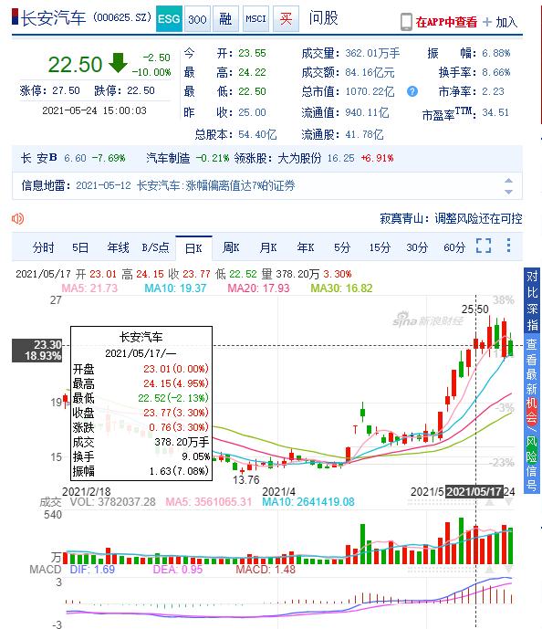 5月24日开盘,在上一个交易日股价涨幅达到8.46%的长安汽车,股价迅速回落,截至当日收盘,长安汽车跌停,报22.5元/股。