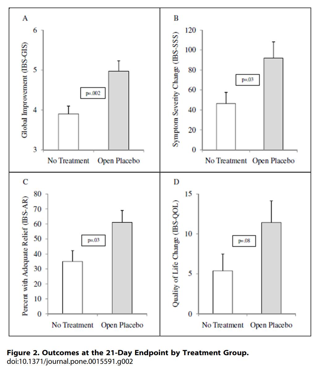 [2]Lembo, A., Kelley, J. M., Nee, J., Ballou, S., Iturrino, J., Cheng, V., ...Kaptchuk, T. J. (2021). Open-label placebo vs double-blind placebo for irritable bowel syndrome: a randomized clinical trial. Pain, Articles in Press. doi: 10.1097/j.pain.0000000000002234