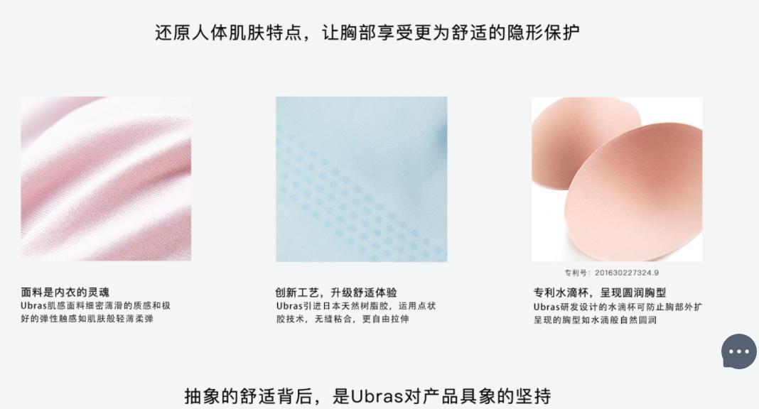 从Ubras官方的介绍可以看出,能够让一个内衣适合不同的大小胸型的技术支撑,核心是采用弹性较好的面料和可以自由拉伸的天然树脂胶,两个专利都是外观和形状层面的并不起根本作用。而面料“极好的弹性”到底是不是核心科技、“极好”到什么程度,官方没有相应表述,也没有相应的明确支撑。