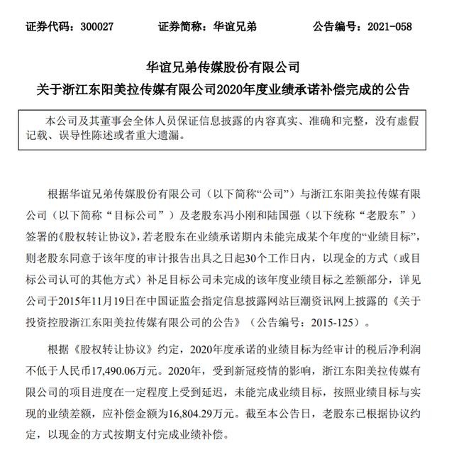24日,华谊兄弟发布关于浙江东阳美拉传媒有限公司2020年度业绩承诺补偿完成的公告。公告称,根据华谊兄弟传媒股份有限公司与浙江东阳美拉传媒有限公司及老股东冯小刚和陆国强签署的《股权转让协议》,若老股东在业绩承诺期内未能完成某个年度的“业绩目标”,则老股东同意于该年度的审计报告出具之日起30个工作日内,以现金的方式(或目标公司认可的其他方式)补足目标公司未完成的该年度业绩目标之差额部分。