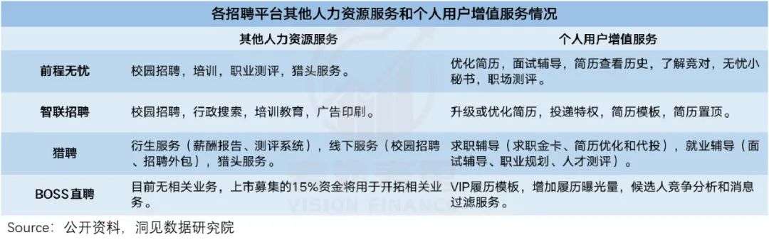 比如前程无忧、智联和猎聘,均在企业端的其他人力资源服务和个人用户增值服务方面,进行新产品业务线开拓。