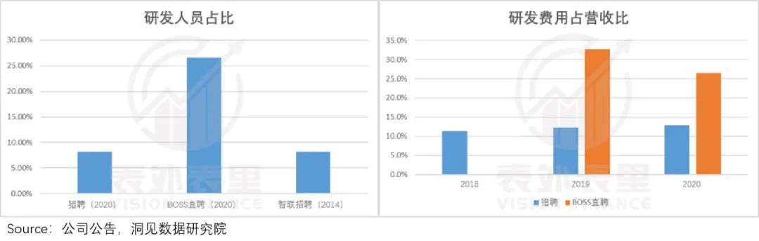 一般来说,这样的方式要真正发挥作用,非常依赖匹配的精准度,少不了重投入。如下图,BOSS直聘在技术上的投入要远高于同行。