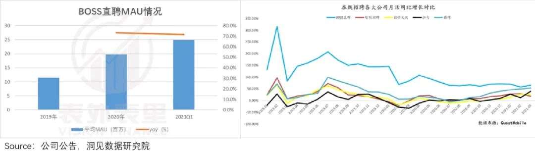 营销宣传到位下,2020年BOSS直聘平均MAU为1980万,同比增长73.2%。同时QM数据显示,过去一年,平台月活同比增速始终保持行业领先。