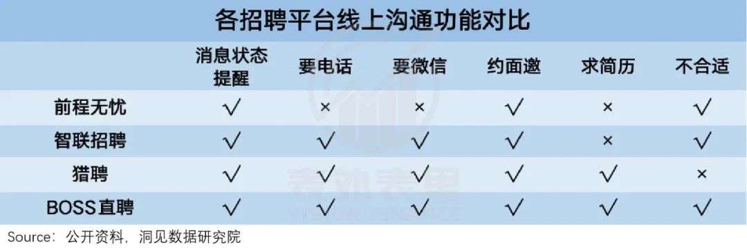 看到直聘的潜力,前程无忧、智联招聘、猎聘等平台的确也在后期增加了直聊功能,但呈现效果参差不齐。